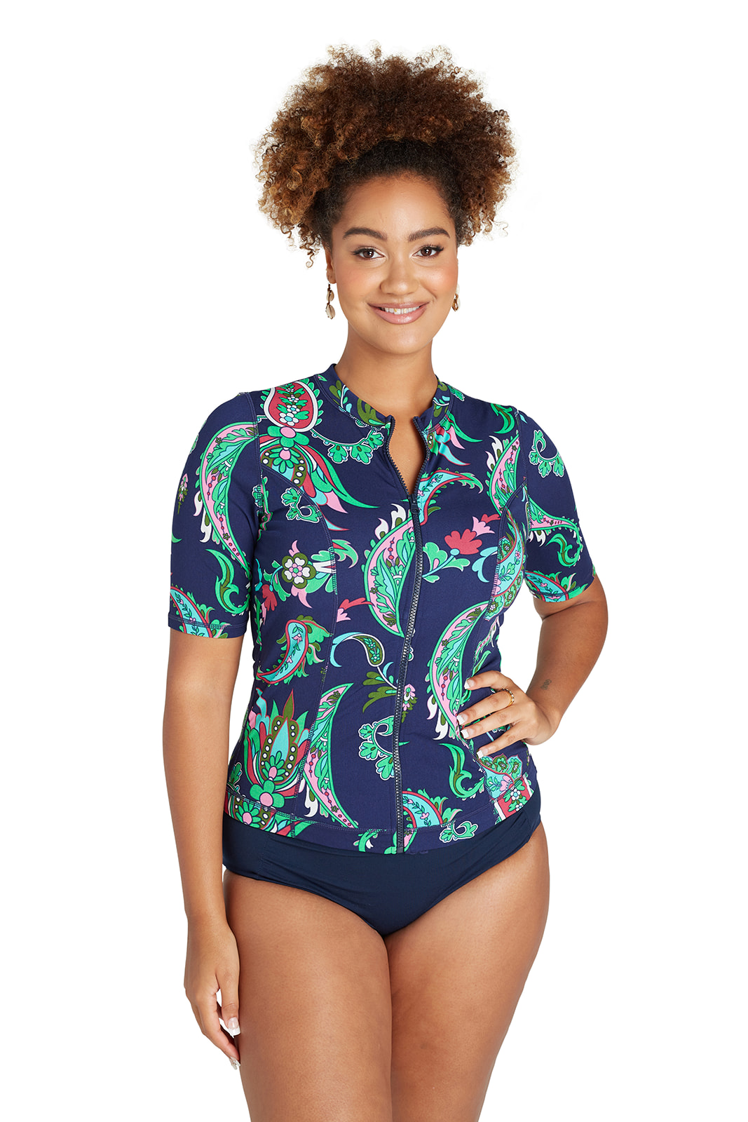 - Full-length front zipper.